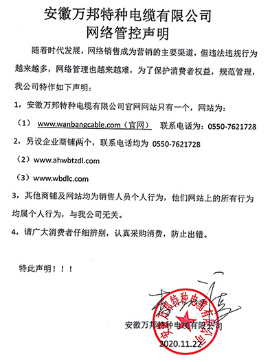 鄭重聲明:安徽萬邦特種電纜有限公司官方網站為:www_wanbangcable_com.zdjcn.com,除此之外無任何子網站或合作網站,其余均為假冒偽劣。電話:0550-7621728 13485756353 地 址:安徽省天長市滁州高新技術產業開發區經四路29號